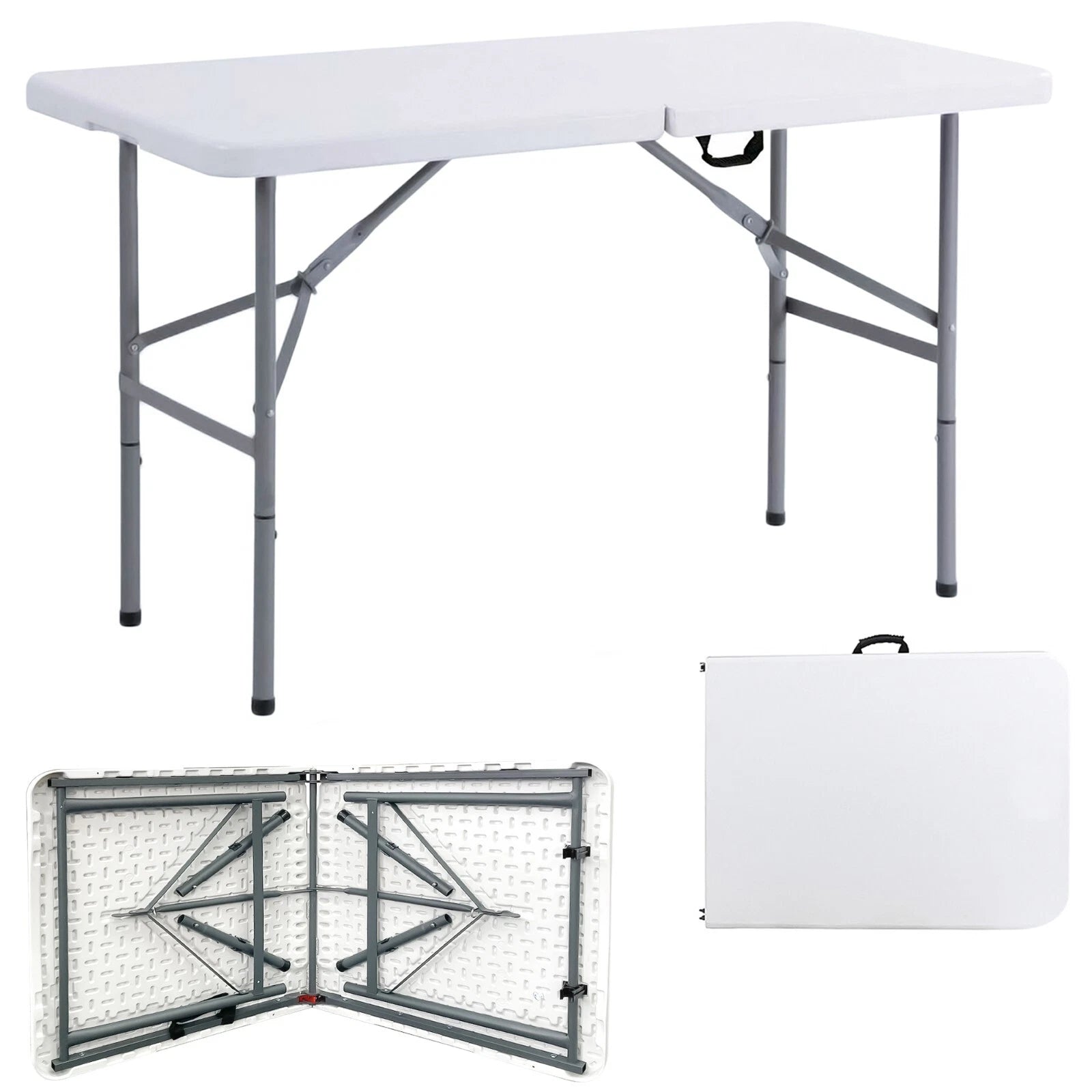 Heavy duty superior quality table is suitable for both indoor and outdoor use. Made from high-density blow moulded plastic with powder coated steel framework. The easy-to-maintain and durable smooth surface is very easy to keep clean. Along with various other uses these table and chairs are ideal for the garden, parties, BBQ's, market stalls and trade shows. The tables are easy to set-up and fold-away when not in use. The table can be folded and locked and comes with a handle for easy transportation.